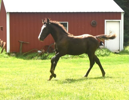 Tonto is a long legged sporty fellow with a curious nature. He was born a beautiful silvery gray and is looking to be a deep chocolatey brown with that distinctive blaze. A real sweet heart. Tonto's pedigree includes Red Correll, Black Correll, Kings River Morgan, Winterset, Romanesque and Squire burger.